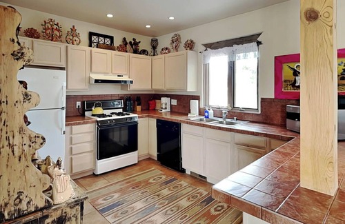 Step into the huge living area of the main house and you'll discover a retro southwestern lodge vibe, combined with sleek contemporary outdoor styling. There's plenty of room for everyone to sit on the plush couches and chairs here. Every large group needs a constant supply of drinks and snacks, no matter how many of northern New Mexico's world-class restaurants they visit -- so you will get a lot of use out of the huge kitchen in the main house.