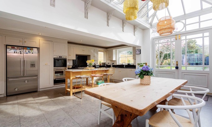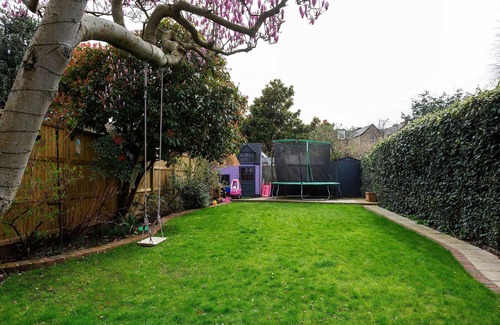 'Never a dull moment' is definitely the catchphrase of this home. Fresh interiors supply the canvas for a veritable feast of colours, patterns, and textures. A chic, contemporary aesthetic is animated throughout by a sense of fun, whether it be a sudden splash of tangerine, an irreverent royal portrait, or simply a rogue disco ball. Five bedrooms, a large playroom, and a grassy garden, make for an ideal family retreat. On the edge of leafy Wandsworth Common, you'll enjoy the quaint village vibes of this South-West London neighbourhood, as well as easy transport links to London Waterloo.