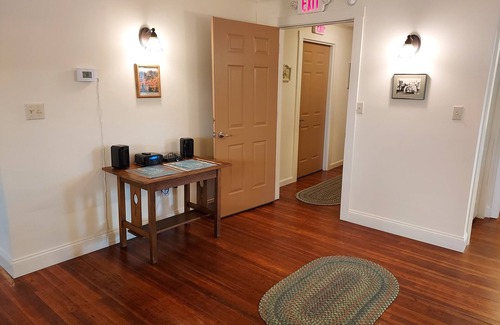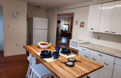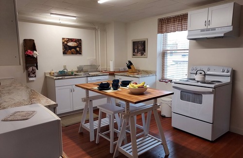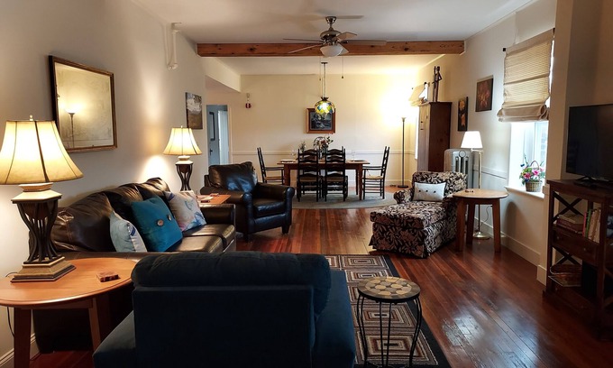 Spacious and meticulously renovated, furnished and decorated, enjoy views south to the Presidential Mountains and listen to the flow of the Dead River just below. In the heart of safe downtown Berlin. Best location for hiking, boating, skiing, or ATV riding! Artists: paint or photograph the scenic beauty of the North Country! Medical professionals: just 6 minutes drive from Androscoggin Valley Hospital, and across the street from Coos County Family Health Services medical building. Fully equipped kitchen with dishwasher, bath with washer/dryer, linens, closets, 2 bedrooms with blackout shades and queen beds!