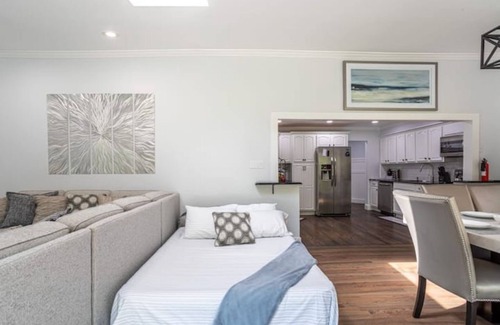 The spacious home comes well-appointed with everything you could need including an impressive gourmet kitchen, a snack & coffee bar, 2 bedrooms, an air mattress and open plan living that steps out into the expansive shared yard.