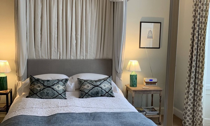 Sleeps 4 comfortably in 2 bedrooms, one a glamorous four poster king size bed with en-suite bathroom and the second bedroom either as 2 single or a king size bed with an en suite shower room. The sitting room, which overlooks a leafy patio garden, has a dining table, TV and antique fireplace. There is a separate loo which is convenient for guests. The kitchen is well equipped with dishwasher and washer/dryer.