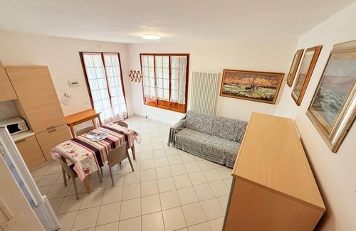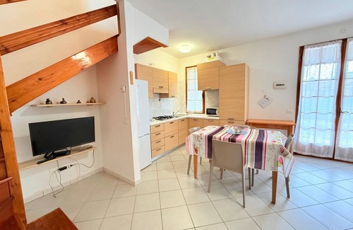 This cozy and bright three-room villa is composed as follows: on the ground floor large living room with kitchenette (gas stove, fridge with freezer) and sofa bed for two people; upstairs bedroom with double bed, bedroom with two single beds and a bathroom with shower, toilet and bidet. Outside there is a large garden with a covered patio, garden furniture and a comfortable grill.
