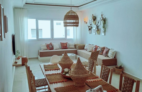 A cozy, cultural and stylish apartment in the city center of Tangier, that can accommodate up to 5 people . Your home away from home while you visit Tanger. This delightful property features 2 cozy bedrooms - one with a queen bed and the other with a twin bed. With amenities like a washing machine, WiFi, and a hair dryer, guests can relax and unwind after a day of exploring. The 2 bathrooms offer a bathtub and hair dryer for added convenience. Experience the magic of Tanger at our apartment.