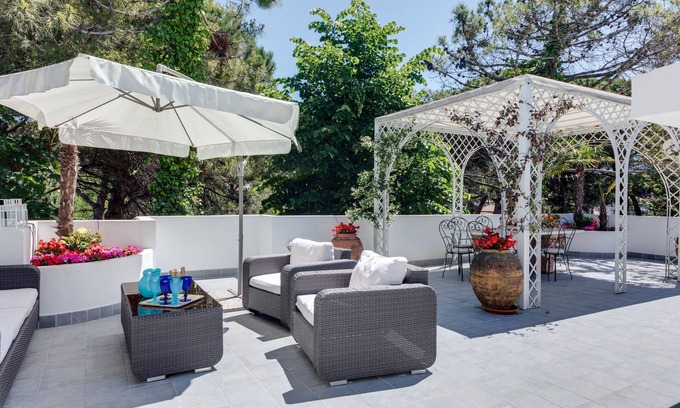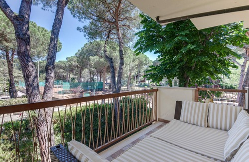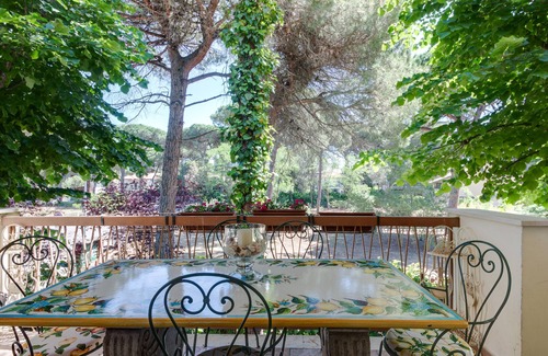 located in an elegant building with 4 units, is just minutes from the beach and the center button, but it 's surrounded by pine trees, elegantly furnished, with air conditioning, and a beautiful terrace of 70 m2 with Jacuzzi, gazebo large dining room, kitchen and living room barbque. The rooms are three, two bathrooms (one with shower sauna jacuzzi) very equipped kitchen, dining room, large garage