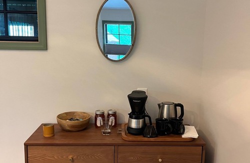 In the bedroom you'll enjoy a comfy queen-sized bed, plenty of drawer space for your clothing and accessories, plus shelves, hanger space and all the bathroom amenities. (**Please note that the room is designed to be spacious and comfortable for 2 people only. We are unable to accommodate extra guests in the room, whether adults or children.)
