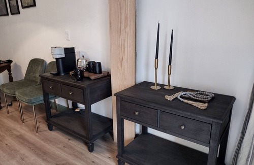 In the bedroom you'll enjoy a comfy queen-sized bed, plenty of drawer space for your clothing and accessories, plus shelves, hanger space and all the bathroom amenities. (**Please note that the room is designed to be spacious and comfortable for 2 people only. We are unable to accommodate extra guests in the room, whether adults or children.)