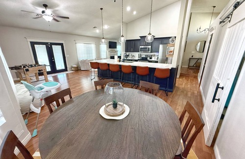 Enjoy open concept spaces where the kitchen flows into the main living areas, perfect for the whole group to gather together where there is still plenty of space for all. Let your inner chef shine through in the gourmet kitchen, fully equipped with everything needed to prep a feast for everyone to enjoy together. Challenge your friends to a game of Foosball, or pull out a board game. Lots of kid-friendly features to be found here: fenced pool, playhouse outside in the grass, Pack N Play, highchair, kid-sized bean bag chairs, black out curtains and light projector with stars in the bunkbed room, kids books and games, and more!