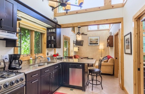 Pinos Altos Casita has a full kitchen (with dishwasher) and utility room with full-sized washer and dryer, as well a large storage room for your gear, bikes, and luggage. One bedroom and a loft with bedding for other guests. Porch, outside dining area, and garden.