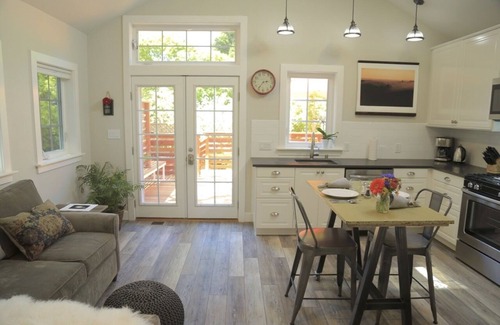 Newly built in 2018, this cottage has all the amenities one would want for a delightful stay in creative, artsy Sebastopol. Very private setting, with large redwood deck overlooking a lovely garden. Vaulted ceilings in kitchen and bedroom give this quaint, modern cottage a very spacious feel. Flooded with light. Decorator touches throughout. Double french door entry opens to full kitchen/dining/living suite. Generous modern master bath, includes a laundry area.