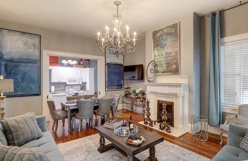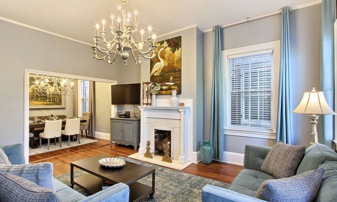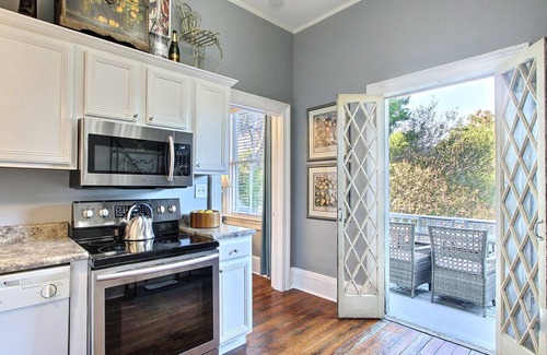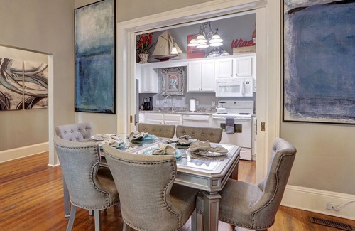 The bright and roomy living rooms on both floors will welcome you with comfy sofas, flat screen smart HDTVs, and decorative fireplaces with grand antique andirons. Oversized artwork and mirrors along with gorgeous chandeliers are sure to wow you! Downstairs, the mirrored dining table comfortably seats six in stylish upholstered chairs. Fix yourself a cocktail from the bar cart and stroll through the Tudor French doors to relax on the classic Southern front porch. Your biggest decision will be the porch swing or rocking chairs. Attached to the upstairs living room is a formal dining room with elegant padded chairs and bench seating. An oversized chandelier and ornately framed nostalgic oil painting add an aura of yesteryear to your dining experience. You will find full well-equipped kitchens on both floors featuring a baker's racks with dishes, cookware, and cookbooks (the owner's wife is a retired professional yacht chef!). Just outside the upstairs kitchen is an extremely luxurious and comfortable balcony porch featuring a dining table and chairs for six which gives you the option of al fresco dining overlooking scenic Hall Street. A comfortable sectional and cocktail table create a wonderful lounging area to enjoy the sights and sounds of Savannah while relaxing with a drink and hors d'oeuvres or later with coffee and dessert.