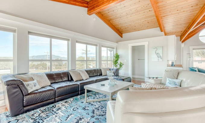 Discover a truly inclusive coastal getaway at this beautiful Cape Meares home, a luxurious, light-filled retreat with a steam sauna, a deck that overlooks the ocean, and an elegant interior perfectly outfitted for guests with limited mobility. An ideal space for a multi-generational family, this home offers comfort and ease to each and every guest. Enjoy the use of a wheelchair-accessible shower and steam sauna, doorways that can accommodate a 35-inch wheelchair, and an elevator that serves all three levels of the house (please note that the elevator is available only to guests with limited mobility upon advance request). Wake up each morning to read the paper or watch TV on the spacious sectional sofas, help prepare breakfast beneath vaulted ceilings in the kitchen (with stainless steel appliances and a dishwasher), and step out onto the deck to breathe in the fresh ocean air. Spend your afternoons searching for sand dollars, and return home to unwind in the private hot tub and sauna, curl up in front of the gas fireplace, and share photos of the day's adventures on the free WiFi.