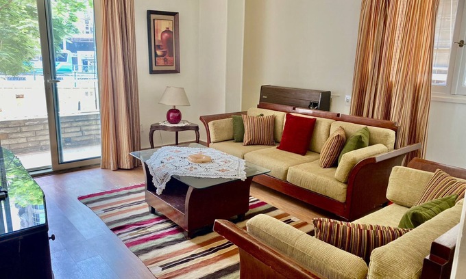 Apartment is cozy, v. well decorated and in excellent condition . in ideal spot location provided with 2 large bedrooms, one with king size bed and sec. room with queen size bed, 1,5 bathrooms, 2 sunny balconies,cozy TV sitting Area, Fully AC, free wirless Wi-Fi, full y electric supplies and kitchen tools