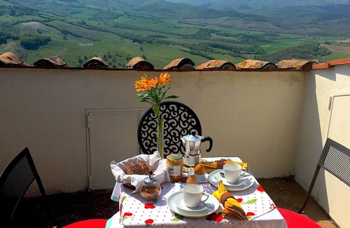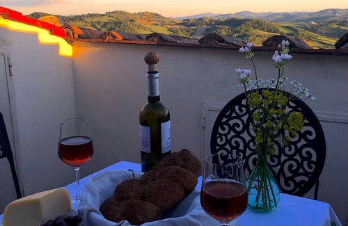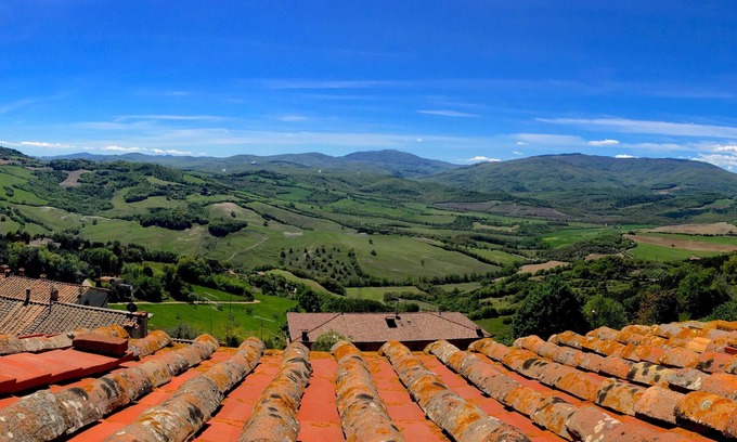Come stay in a beautiful duplex apartment in the heart of the charming hilltop village of Radicondoli. A very spacious 180 m2 (1800 sq ft), with two large double bedrooms, 1 smaller room with a single sofa bed, three full baths, spacious lower and upper living areas, and a small terrace with a fantastic view of the surrounding countryside. Original 14th century details - wall niches, ceiling beams and terracotta floors - blended with luxurious contemporary Italian design. The convivial marble counter top island kitchen, with dishwasher and fireplace, is accented with a beautiful wall of unique travertine; antique furniture; washing machine, wireless internet in the entire apartment. Short drives to Siena, Florence, San Gimignano, Volterra, Colle Val d'Elsa, San Galgano, and the beach. You can use the village as a quiet home base far from tourists, for drives throughout Tuscany, or just stay here to relax and eat.