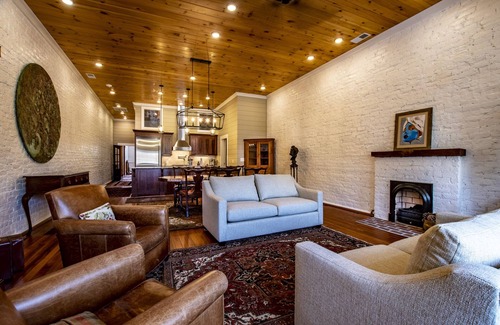 There are 3 separate living areas: The first is the forward living room facing Broad Street. This space is open to the dining area and an open galley kitchen; The second, is at the rear of the loft. There is a spiral staircase from that area up to the bunk bed rooms which are suspended above the rear living room. Third, is a covered cedar cabana over the garage with a gas fireplace.
