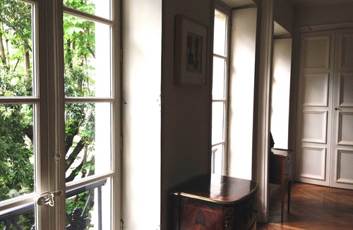 The apartment is located on the Rive Gauche (Left Bank), a block from the Seine (across from the Louvre) and a five-minute walk from the Café de Flore and Saint-Germain.