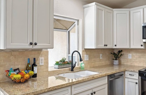 The large, modern kitchen comes equipped with everything you need to cook at home—perfect for extended stays or cozy nights in.