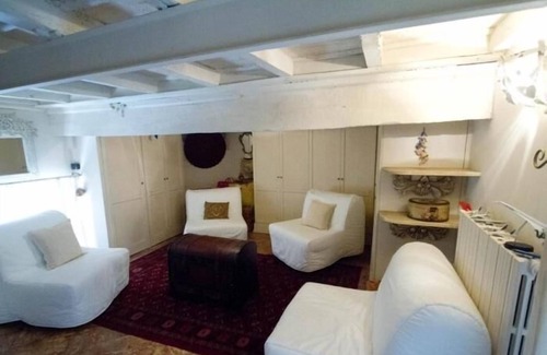 Ground floor: living room with fireplace, small equipped kitchen and small bathroom with an ancient holy water basin.