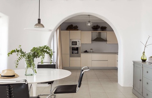 The villa has a spacious open lobby with a stylish yet comfortable living room, including a fireplace, and an elegant dining area. The Myconian style kitchen is fully equipped with state-of-the-art appliances.