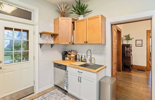 The renovated kitchen is small, but comfortable and clean, boasting modern conveniences, essential utensils and exquisite cookware. A large single basin sink, a small table with stools, a double-door fridge, dishwasher, full stovetop/oven, a fully stocked cofee & tea bar, and plenty of cabinetry.