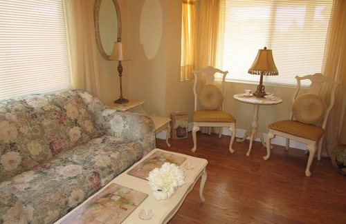 The large sun room/reading/game room measures 25 feet by 13 feet where you find another dining table that seats 4-6, a wicker love seat & 2 matching wicker side chairs, as well as 2 Royal Garden at Waikiki elegant arm chairs w/ plenty of cheerful floral décor. The sun room overlooks the back deck & backyard.