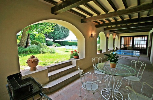 The villa offers a private pool (available from April to September) and garden, with an outdoor covered dining area under a porch that includes a BBQ area and a full bathroom with a shower for pool use.