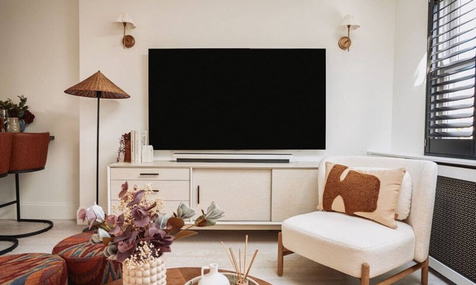 The main living area is a spacious, artistically designed haven, featuring a stylish Andrew Martin sofa and a 70` smart TV. Log in to your favorite streaming services like Netflix, or enjoy Sky TV for a cozy night in.