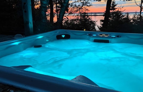 Elenriel cottage has been finished with an 800 square foot wrap-around cedar deck outside that is protected by plexiglass railings. The wide side deck accomodates the aforementioned outdoor table, and the deck facing the water has a generous seating area with sizable Muskoka chairs covered with comfortable cushions. The lower deck has two more chairs beside the six person hot tub that overlooks water, trees and the shoreline as part of its view.