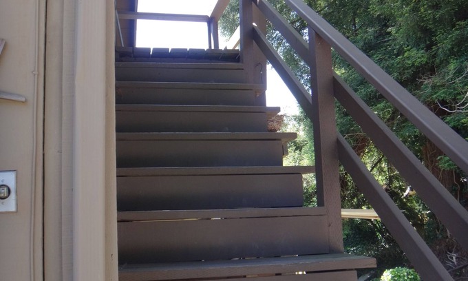 There is a flight of stairs on the exterior of the building to get to the apartment.