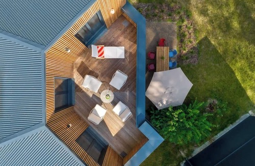 In the early 1990s, the architect had a really clever idea for the lakeside property: he placed the 11 vacation homes with their hexagonal floor plans next to each other so that you