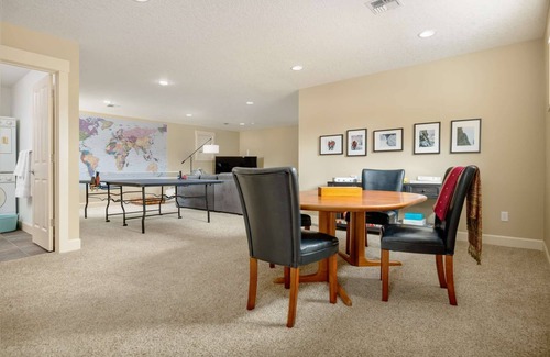 The bonus room has a game area stocked with games as well as a ping pong table for your enjoyment. The sleeper sofa offers room for two more to sleep as well as a 65" Roku enabled TV for your streaming desires. There are three full bathrooms and a laundry area on the second floor to provide ample utility and space for groups staying.
