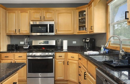 1800 SF unit is located near O'hare Airport, Schaumburg, and Hoffman Estates, which gives easy access to plenty of bars/restaurants! This property has 4 bedrooms, 2 full bathroom. Master suite has a KING, 3 rooms have Queen beds. The home has space for the 1 air mattress on-site. (Total of 5 beds). Plenty of Kitchen utensils, including cooking spices and oils! Children friendly & lots of technology!
