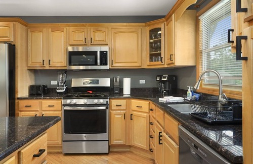 1800 SF unit is located near O'hare Airport, Schaumburg, and Hoffman Estates, which gives easy access to plenty of bars/restaurants! This property has 4 bedrooms, 2 full bathroom. Master suite has a KING, 3 rooms have Queen beds. The home has space for the 1 air mattress on-site. (Total of 5 beds). Plenty of Kitchen utensils, including cooking spices and oils! Children friendly & lots of technology!