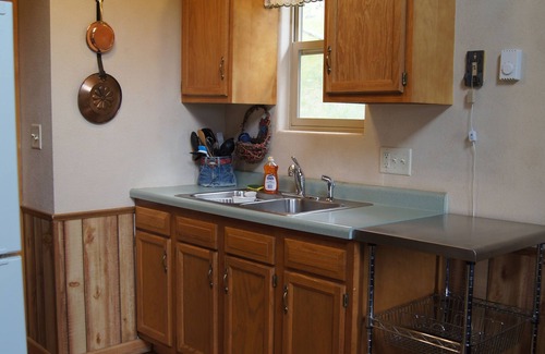 Check out our newest property located just 3/4 of a mile up the road past the cabins. The Bluebird's Nest is a brand new garage apartment with a master bedroom and bunk room. It has one Twin XL and one Full size bed in the bunk room, Queen bed in master bedroom, and queen pullout couch in the living room. The kitchen has a full size refridgerator/dishwasher and microwave. Bathroom with double vanity. This location has heat and A/C. Property backs up to Forest Service and view of Crazy Horse. Peaceful and beautiful location.