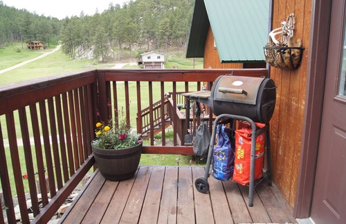 There is a master bedroom with queen bed and closet, with direct access to a spacious bathroom with a shower. The loft area above is divided for privacy and has 2 queen beds. There is also a living and dining room area. Each cabin has a full kitchen with all the amenities of home which include stove, refrigerator, toaster, coffee pot, blender, dinnerware, silverware, pots, pans, cooking utensils, bakeware; everything down to spice rack, dish/hand soap, hand and paper towels. Each Cabin has it own private deck with outdoor furniture, BBQ with tools, and great views of wildlife! Elk Haven is a great space for a family to spread out and get comfortable and immerse yourself in the atmosphere of the Black Hills.