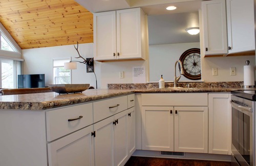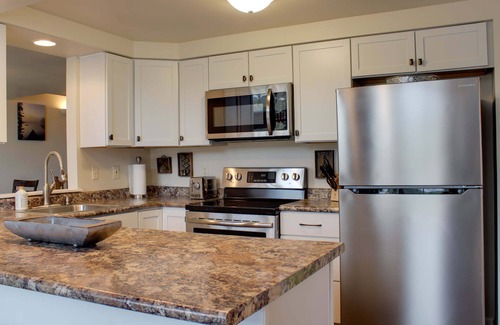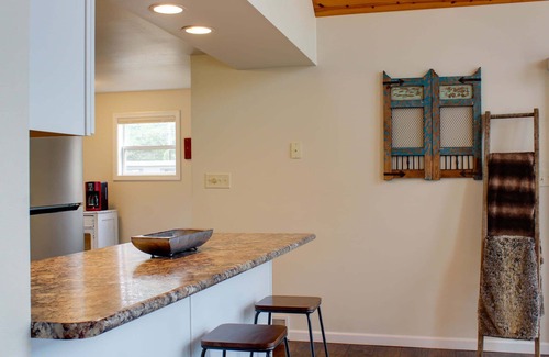 Elkhorn is a completely renovated Lodge that features 3 levels with each level having a bedroom and bathroom. It is extremely clean and tastefully decorated with rustic-modern touches. Several families can enjoy being together while having their own space. All 3 bedrooms have queen beds and 2 bathrooms have showers. Smart Tv’s are located on the main and lower levels. The main level has a dining room, fully stocked kitchen, and a stunning Great Room with lake views from every angle It has an electric fireplace (electric fireplace is seasonal use only). Off to the side is a coffee bar for that morning cup of coffee which can be enjoyed from the wraparound deck.