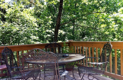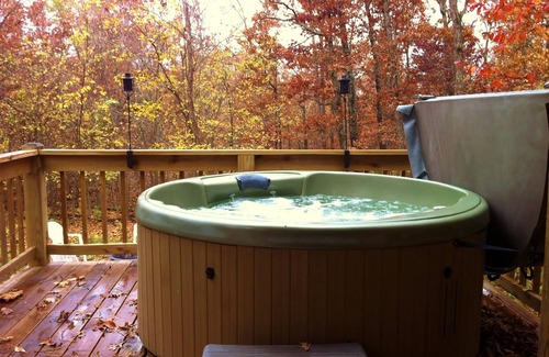 Ellen's log cabin is 2 and a half story's. It starts with a large covered porch that looks over the valley, a great place for your morning coffee. Walk into the living room with a cathedral ceiling and stairs that lead to the loft. The loft is where the master bedroom is located with an en suite bathroom. Back to the first floor is a full kitchen with a large walk out deck that is actually in the trees. This deck has a large table for outdoor eating and charcoal BBQ grill for grilling. Remember to bring charcoal and lighter fluid. The lower floor has 2 bedrooms, family room (which doubles as another private bedroom) and full bathroom. From the family room you walk out to a private lower deck with a hot tub and seating. A fire pit is in the back yard surrounded by woods, very private. Do not worry about where to buy the wood for your fire, we provide it with your cabin.