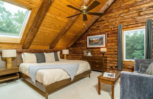 Ellie's Lodge is a beautiful log cabin located at the end of a quiet gravel road on Rolling River Holidays. When entering the cabin, one is invited into the large open living room, dining area and kitchen. A spiral staircase welcomes a large second floor loft with a TV and game table. Sitting on the lovely hillside, Ellie's offers beautiful views of the Blue Ridge Mountains (and in the winter season the Shenandoah River just below). As you walk outside, there is a private porch, patio and lawn to enjoy the views or enjoy the wood burning fire pit! Only 0.4 miles from the Shenandoah River where you can enjoy kayaking, tubing and fishing on the river.
