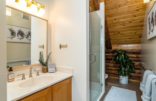 The house offers three large bedrooms and three and a half bathrooms along with a side entrance opening to a laundry room and mudroom area for those returning from their outdoor adventures. If you love the outdoors, beautiful views and log cabins, Ellies is the perfect getaway!