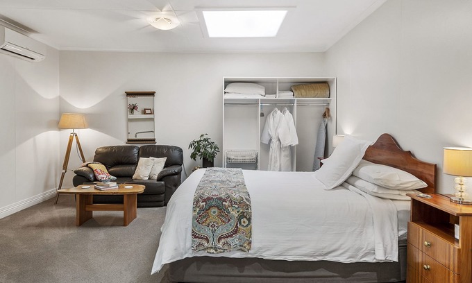 The Studio has a pillow top queen size bed with underlay, top quality bed linen and electric blanket. There is a high back Italian leather sofa, a reverse cycle air conditioner / heat pump, a flat screen TV, DVD player and quality timber furnishings. FREE WiFi