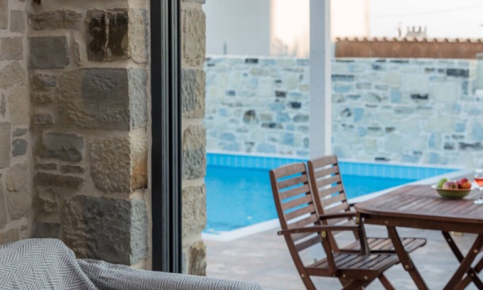 ELMARA luxury residence is situated in Kokkinos Pirgos, offers breathtaking sea views and is only a few meters from the sandy beach. Nestled just behind the coastal road, it features three stone-built houses, each with its own private swimming pool.