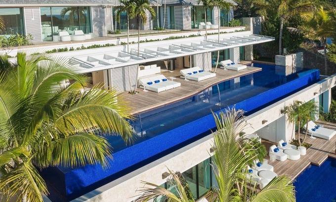The terraces of the luxurious holiday rental villa Embrace are an ode to the ocean’s beauty, in the soothing mildness of the trade winds that blow over the island. There are two infinity swimming pools, a thirty-meter one in the extension of the living room on the middle level with a wonderful view, and a fifteen-meter second one on the lower level. Deckchairs, comfy lounges, waterfalls, a massage room and a hammam with bathrooms are at your disposal in this villa where luxury and beauty meet grace and some kind of obvious perfection.