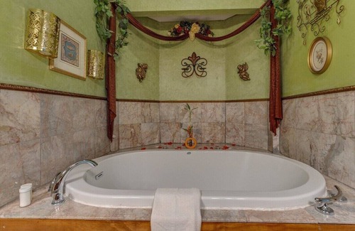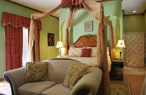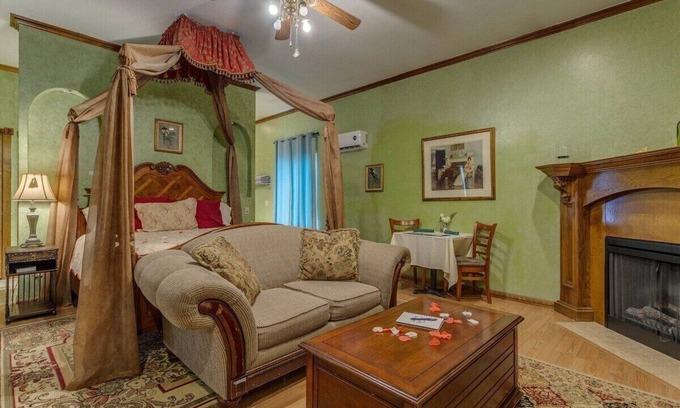 Emerald Dreams Cottage Suite is completed with pure charm and elegance. The stylish European like canopy drapes the four poster king size cherry wood bed with a lustrous loveseat and a grand fireplace. Also features a dining area, kitchenette, and a marbled bathroom with a whirlpool for two. This suite overlooks the astonishing pavilion and pond. Pet friendly. $35 per pet fee plus $50 refundable deposit