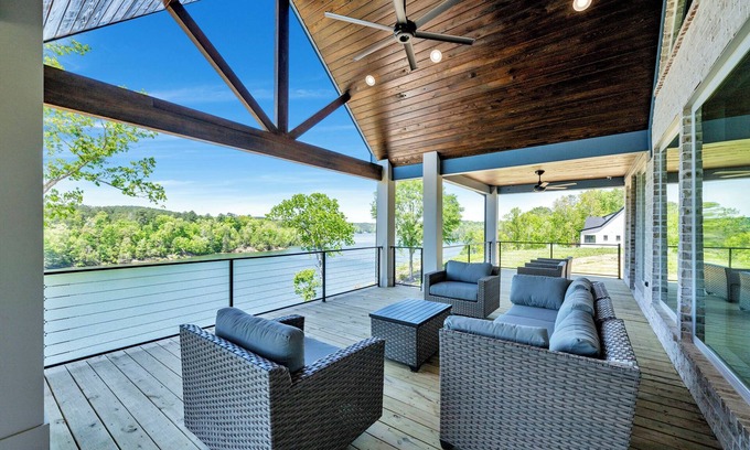 Serenity on Smith Lake! Luxury escape located in Crane Hill, AL, perfect for couples to enjoy the peace, quiet, and beauty of the lake. Take in million-dollar views of emerald trees and water surrounding this newly built home. Master bedroom with king size bed and big screen smart tv. Master bathroom features double vanity, oversized walk-in shower, and soaking tub. Open living room with gas fireplace and fully stocked kitchen, both lined by a wall of windows overlooking the lake. Take in the sunset on a huge balcony with dining table, and two sitting areas. Relax in lounge chairs on a deck just above the lake, and fish or swim from private dock with a boat slip. 30 minute drive from I-65 and Cullman, AL.