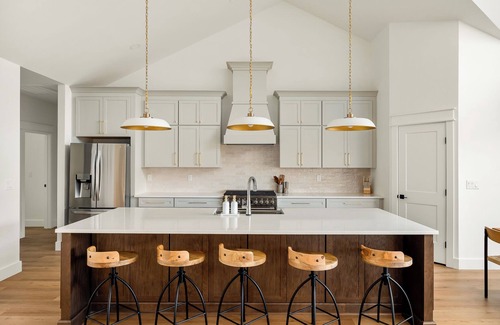 The handmade oak dining table comfortably seats 10 🍽️, making it perfect for family meals or celebrations. The spacious island has additional seating for 5. Dining spaces are equipped to accommodate multiple families and children, and children's utensils and cups are provided for ease.