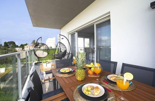 Apartment block "Emerson Plaza". Outside the resort, 450 m from the sea. For shared use: beautiful garden to relax, swimming pool angular (20 x 12 m, depth 145 - 145 cm, seasonal availability: 01.Jan. - 31.Dec.). Outdoor shower. In the house: WiFi, lift, air conditioning. Communal covered parking space n 5. Shop 1.5 km, grocery 1.5 km, supermarket 1.5 km, shopping centre 3.5 km, restaurant 240 m, bar 750 m, bakery 1.5 km, café 1.5 km, bicycle rental 2.7 km, bus stop 1.3 km, railway station 3.5 km, sandy beach "Praia do Amado" 450 m, diving center 3 km. Sports harbour 3.4 km, marina 3.4 km, golf course (18 hole) 3.2 km, surf school 3.5 km, sailing school 3.3 km, tennis 2 km, riding stable 7.4 km, sports centre 1.8 km, children's playground 2.7 km, fishing possibilities 3.4 km. Nearby attractions: Museu de Portimão 2.5 km, Parque de Feiras/Exposições de Portimão 4.3 km, Adventure Golf Alvor 4.6 km, Slide & Splash 9.5 km, Sand City 16.6 km, Autódromo Internacional do Algarve 5.9 km. Hiking paths: Parque da Juventude 1.7 km, Algarve Jeep Safari Tours 2.9 km, Passadiço da Praia da Rocha 3.2 km. Please note: car recommended. Suitable for families. The owner does not accept any youth groups. Loading and unloading of baggage is possible at the holiday house.