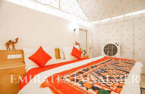 Located in Jaisalmer, 27 miles from Jaisalmer Fort, Emirates Luxury Desert Camps provides accommodations with a garden, free private parking, a shared lounge and a terrace. Each room at the 4-star resort has sea views, and guests can enjoy access to a restaurant and to a bar. The property has evening entertainment and a shared kitchen. The resort offers a buffet or vegetarian breakfast. Emirates Luxury Desert Camps has a playground. Staff at the accommodation are always available to provide guidance at the reception. Desert National Park is 2.7 miles from Emirates Luxury Desert Camps, while Patwon Ki Haveli is 27 miles from the property. Jaisalmer Airport is 24 miles away, and the property offers a paid airport shuttle service.