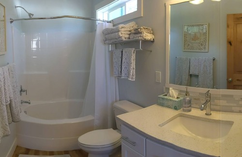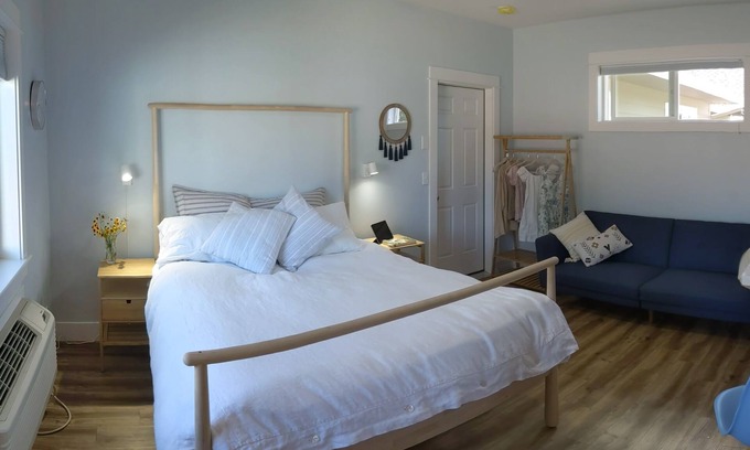 Custom built w understated elegance in a modern & functional floor plan. Quality sheets and a down comforter, all on a Tempurpedic mattress on the only queen bed. Futon couch is 3rd person bed (3 guests max). Oversized bathtub/shower, large vanity, quartz countertops, separated 2nd sink/kitchenette area with Keurig coffee maker, toaster, mini fridge and microwave. Separated private entrance & patio w 24hr contactless self check-in & private secure parking on far side of my home on nearly an acre. Only shared wall is with Boat garage. Close to Honeysuckle Beach and downtown.