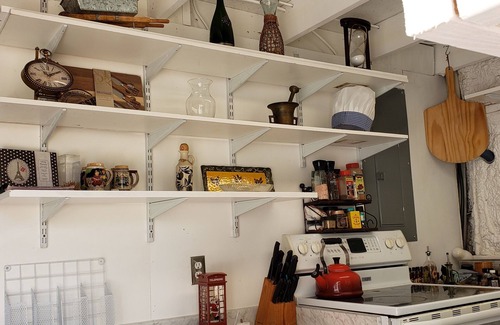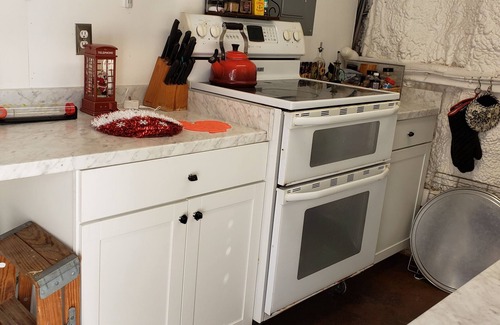 This charming property features a queen bed in the first floor and a cozy loft bedroom with a queen-sized mattress, accessible by ladder, and includes a chest of drawers and a desk. While the loft has a low ceiling, it's thoughtfully designed for comfort. The full kitchen is perfect for preparing meals, and the detached building houses a full bathroom with a shower. Additional amenities include a washer, dryer, television, A/C, heat, and a faux fireplace for a cozy ambiance. You'll also find a piano and a large dining table, all set within castle-inspired décor for a unique experience.