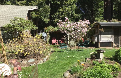 The Cottage at Mendocino Farmhouse is part of a family property in a redwood forest just minutes from the village of Mendocino and the ocean. The cottage has all the amenities to make your stay comfortable and enjoyable. Step outside your door do a beautiful garden with flowers in season that are a haven for butterflies and hummingbirds. We even have a small flock of bantam chickens in the garden for your enjoyment. Come visit soon and see for yourselves.