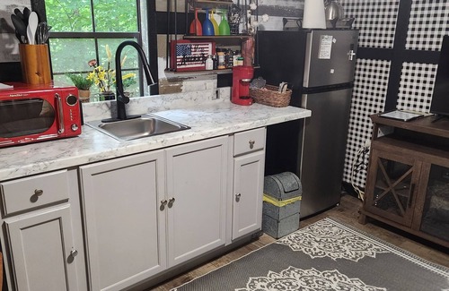 Cozy up to warm electric fireplace feel the heat while sipping a hot cup of tea. This Enchanted tiny house will embrace you as soon as you pull in